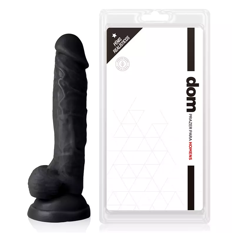 Pênis Realístico com Escroto, 19 cm de comprimento e 3,5 cm de diâmetro com glande saltada e veias em relevo para penetração vaginal ou anal.