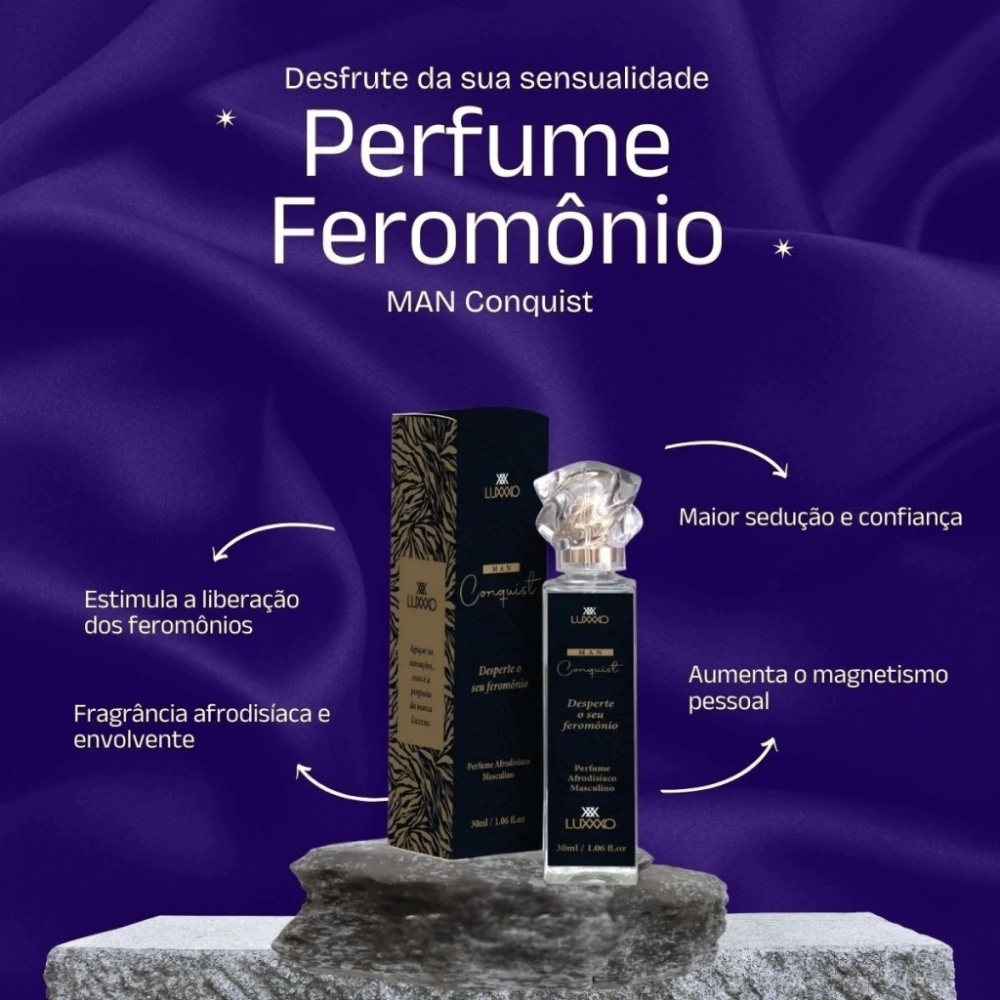 O MAN Conquist – Luxxxo Cosméticos é o perfume que vai elevar seu poder de conquista! Enriquecido com feromônios naturais, ele estimula o interesse feminino de forma sutil, enquanto sua fragrância marcante une notas amadeiradas e especiadas, conferindo um charme irresistível. Compacto (30 ml) e elegante, cabe em qualquer bolso, pronto para acompanhar seus melhores momentos.