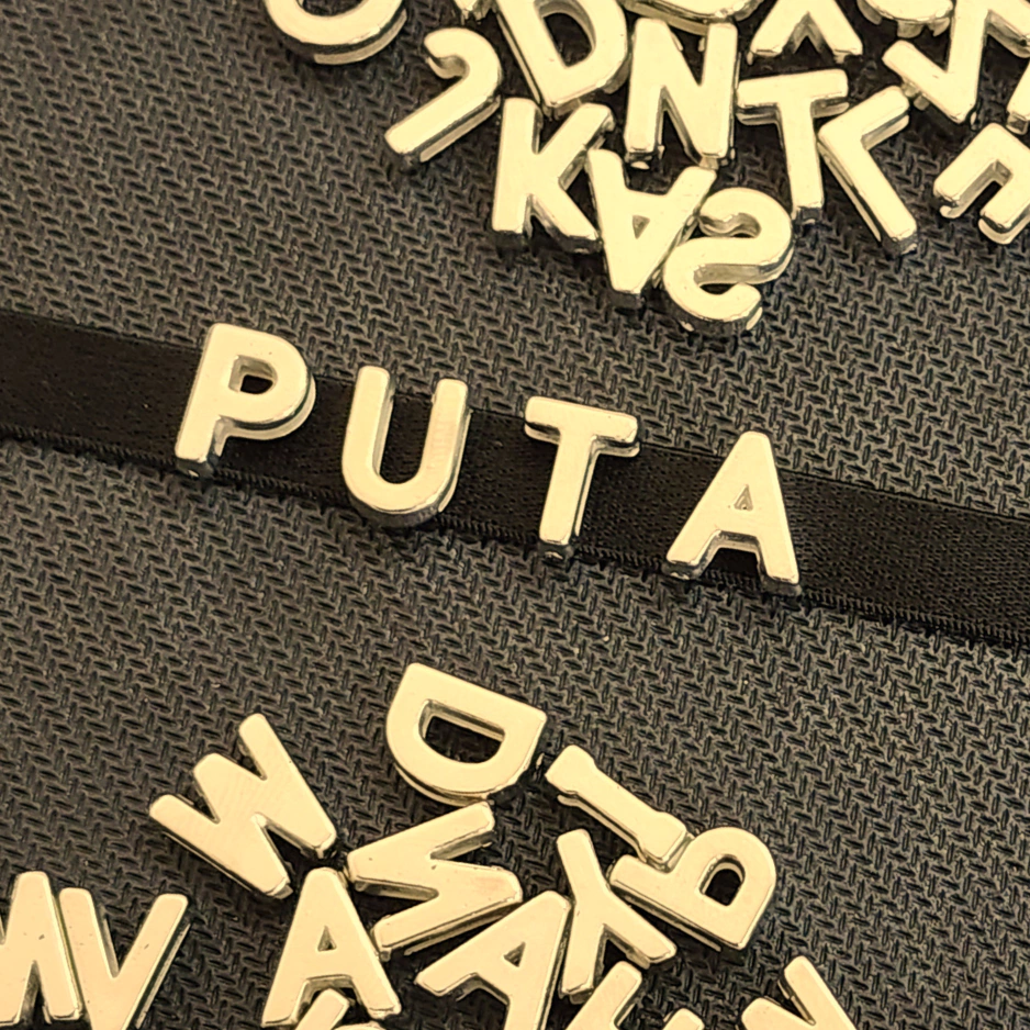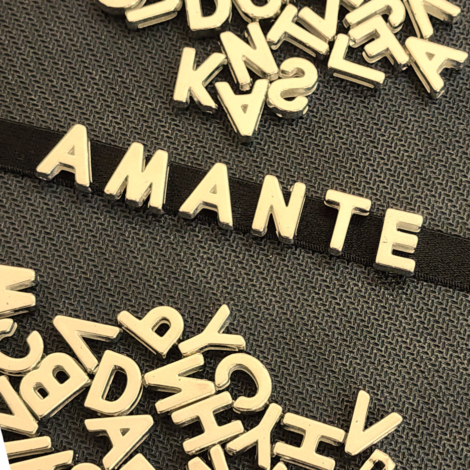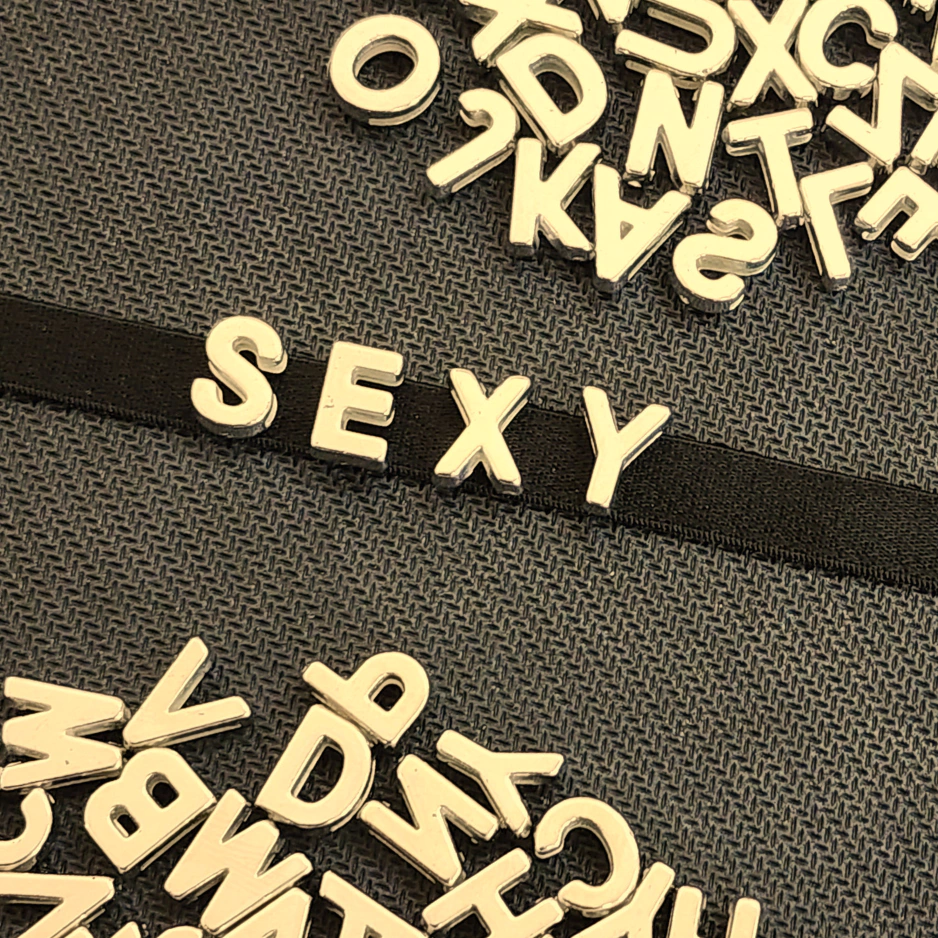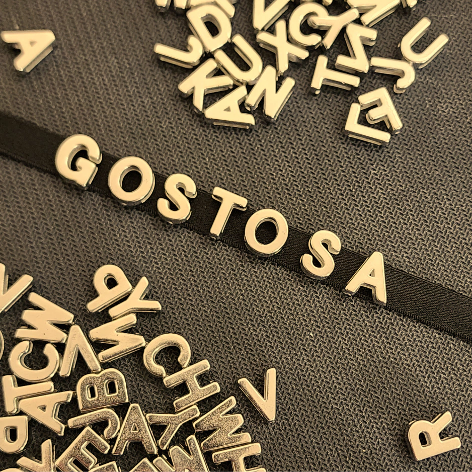 Com encaixe rápido e fácil, você pode escrever palavras provocantes, nomes ou frases que vão arrancar risadas, olhares ou até suspiros. As letras metálicas douradas ou prateadas se fixam firme na tira, garantindo estilo e impacto visual imediato.